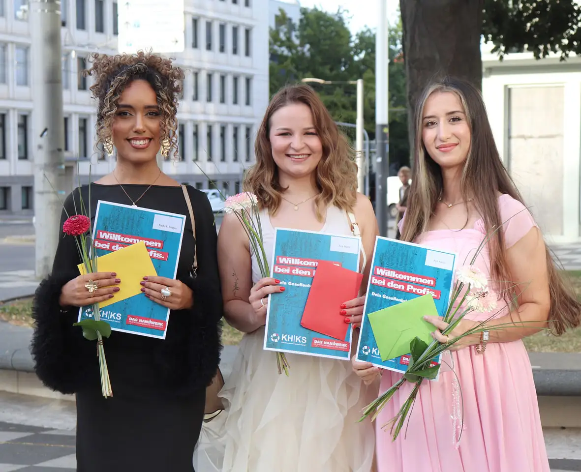 Mit der einen oder anderen Anekdote gewürzt, überreichte er dann zusammen mit Alexandra Kaske-Diekmann und Vertretern des Prüfungsausschusses die Gesellenbriefe. Als Innungsbeste besonders geehrt wurden die Erstplatzierte Nadia El Ssaguir (Ausbildungsbetrieb: BZ, Kassel), die Zweitplatzierte Ana Matic (Hairkules GmbH, Kassel) und als Dritte Avin Kanjo (BZ, Kassel).