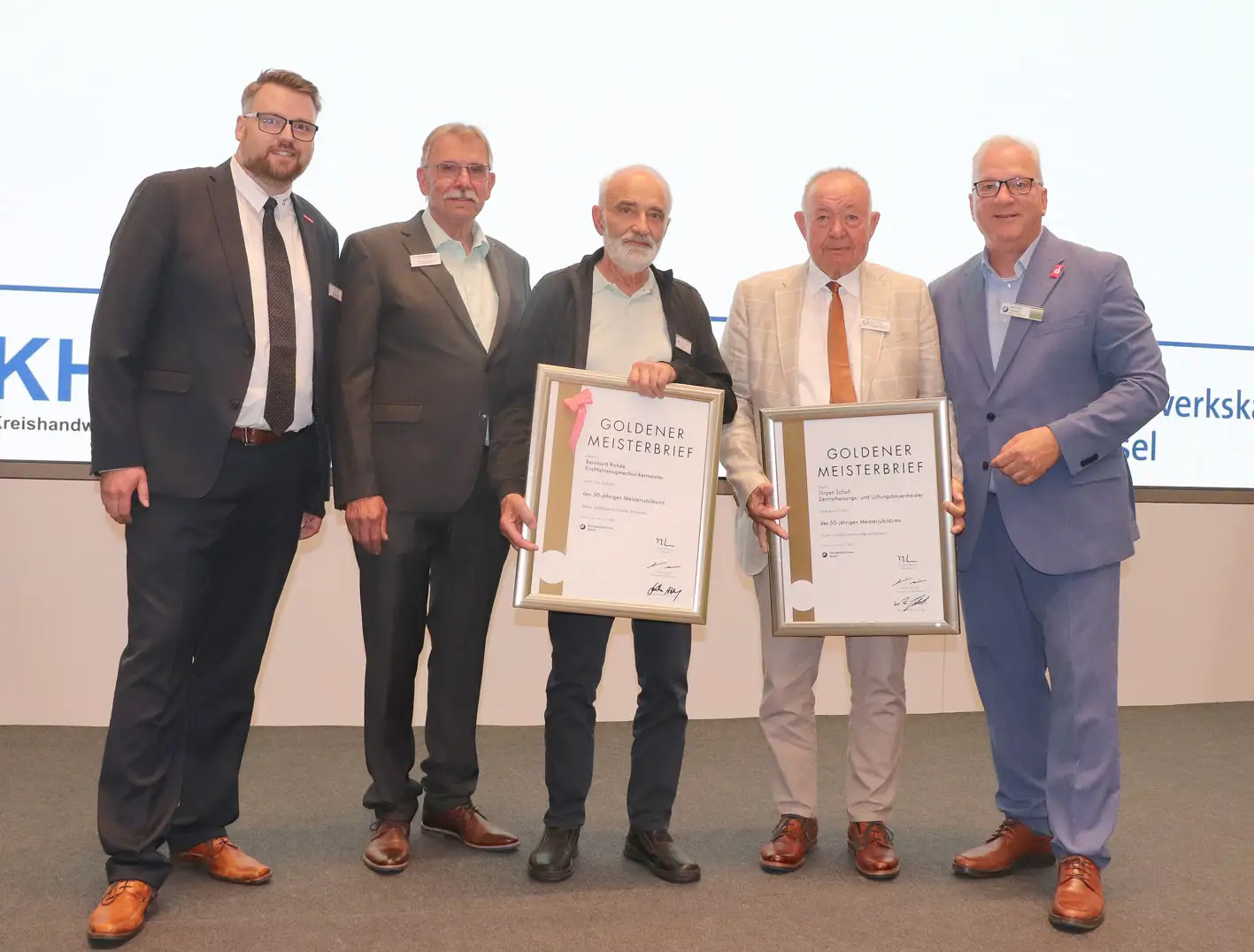 Uwe Sachelli, Abteilungsleiter Meister- und Fortbildungsprüfungen bei der Handwerkskammer, stellte sein Grußwort unter den Titel „Außergewöhnlich“. Außergewöhnlich sei diese Feier einmal im Jahr, der neue S-Finanz-Campus, die Leistung der zu Ehrenden aber auch die langjährige Berufstätigkeit zweier Handwerker. Für ihre 50-jährige Meistertätigkeit erhielten der Kraftfahrzeugmechanikermeister Bernhard Rohde und der Zentralheizungs- und Lüftungsbaumeister Jürgen Scholl jeweils den Goldenen Meisterbrief.