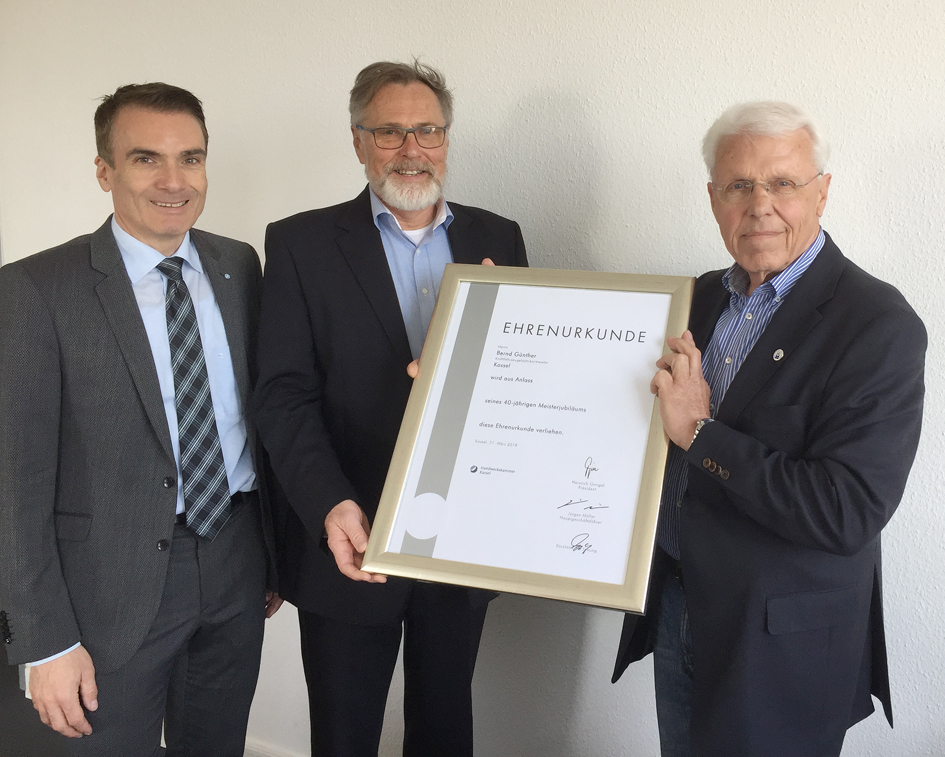 BU: 40 Jahre Meistertätigkeit: Jubilar Bernd Günther mit Obermeister Georg Wolf (r.) und Dr. Norbert Wett, Geschäftsführer der Kreishandwerkerschaft Kassel. (li.) . Foto: khw